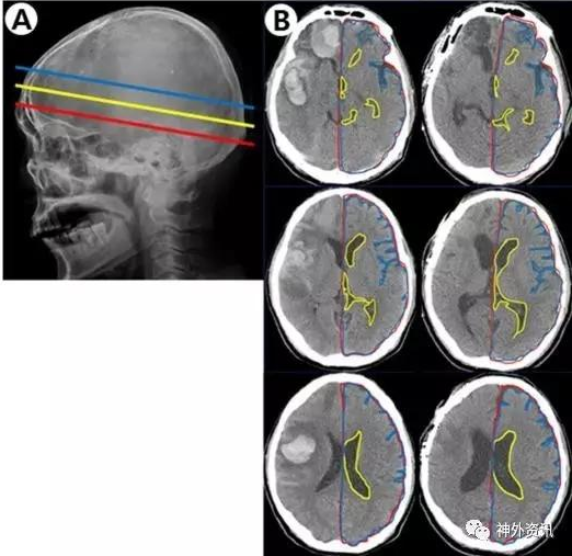 該研究收集作者所在單位2011年至2015年接受手術(shù)治療的自發(fā)性腦出血患者。研究對(duì)象的血腫位于幕上單側(cè)大腦半球;根據(jù)術(shù)前和術(shù)后3個(gè)月在頭顱CT軸位3個(gè)平面,即室間孔平面、透明隔平面和側(cè)腦室平面上的影像片(圖1)